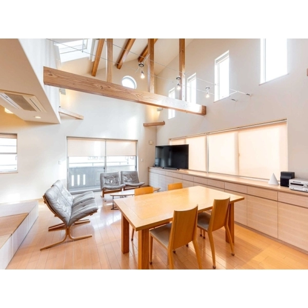 ■勾配天井と天窓により開放感のあるリビング