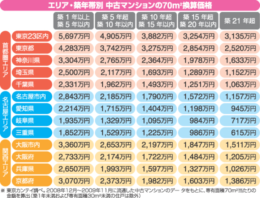 下の表は、築年帯別の中古マンションの平均価格です。エリアを問わず築年数が古いほど安くなっていますが、その半面、リフォーム費用は古いほどかさむのが普通です。